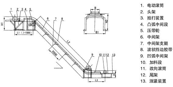 (1)、大傾角皮帶輸送機(jī)為一般用途的散狀物料連續(xù)輸送設(shè)備,但采用的是具有波狀擋邊和橫隔板的輸送帶。因此,特別適用于大傾角及垂直90°輸送。