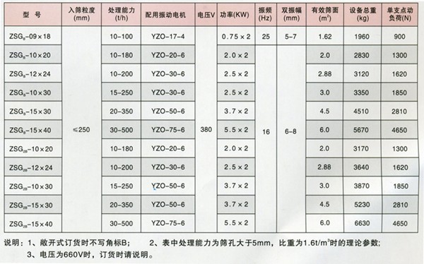 ZSG系列**振動(dòng)篩技術(shù)參數(shù)(配用振動(dòng)電機(jī)):